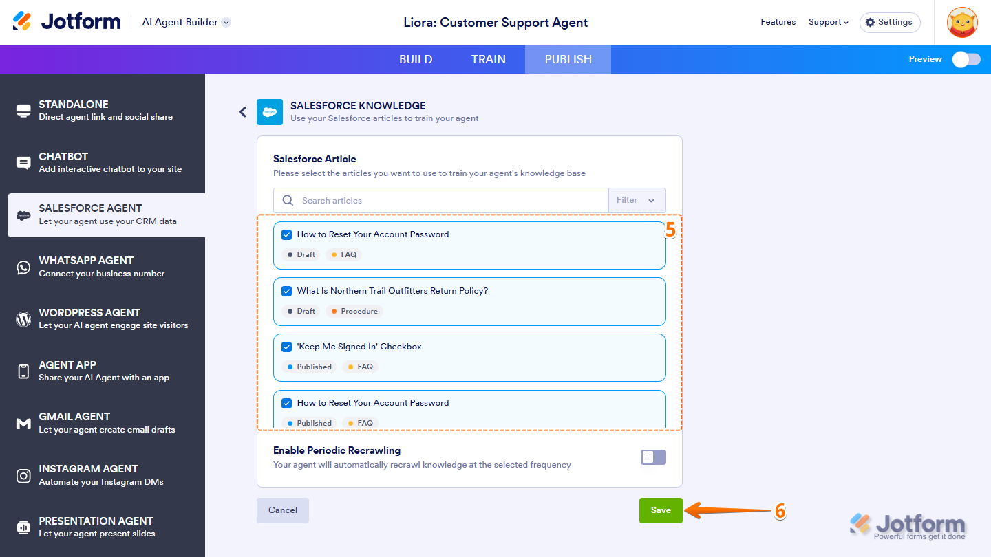 - Enable Periodic Recrawling — Toggle this on to automatically refresh your Knowledge Articles on a daily, weekly, or monthly schedule. This keeps your agent up to date with the latest versions of them, so you don’t have to re-add them manually each time.