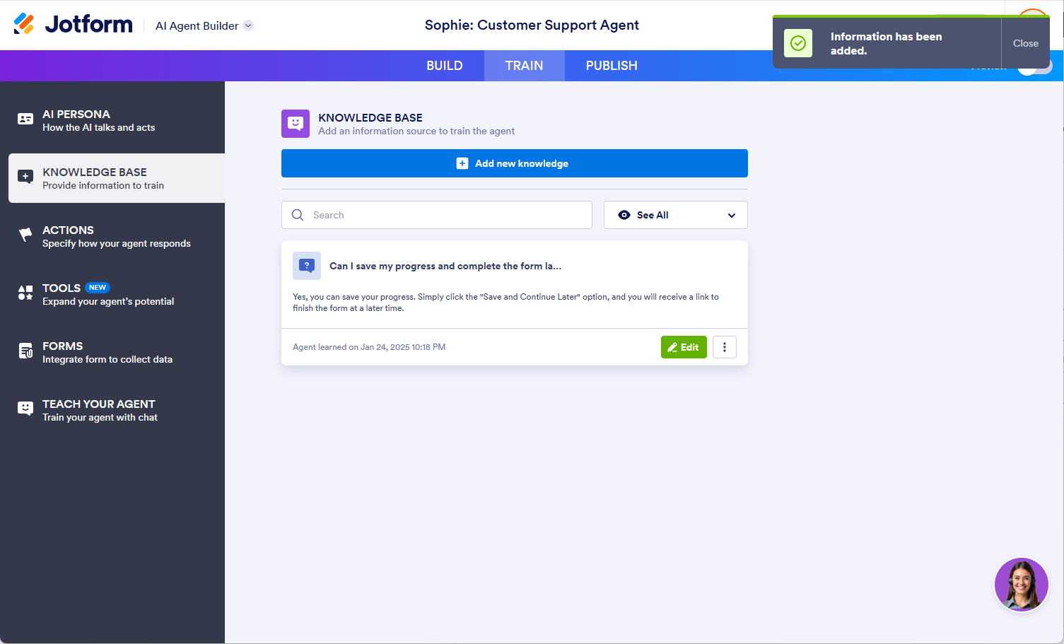 - In Jotform AI Builder, click on Train.