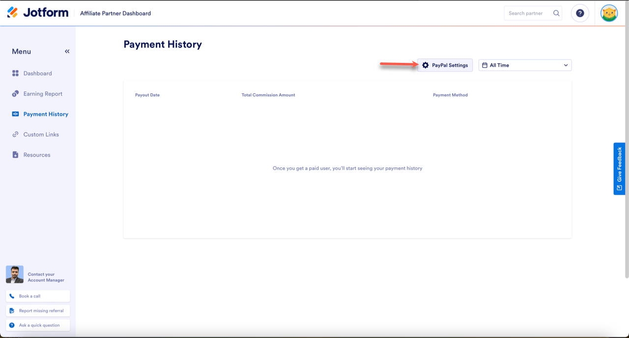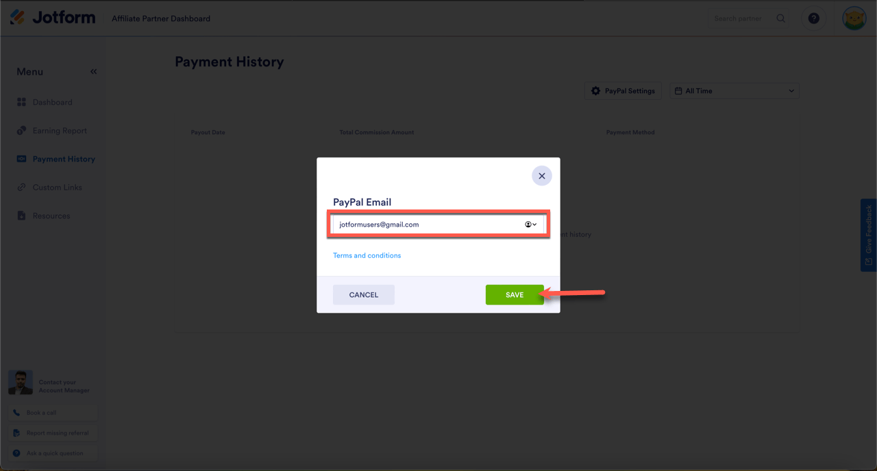 If you’re a part of the Jotform Your PayPal email address must be current and live in order to receive your commission. If it has changed, or you entered it incorrectly, you can easily update it in the Partner Dashboard.
