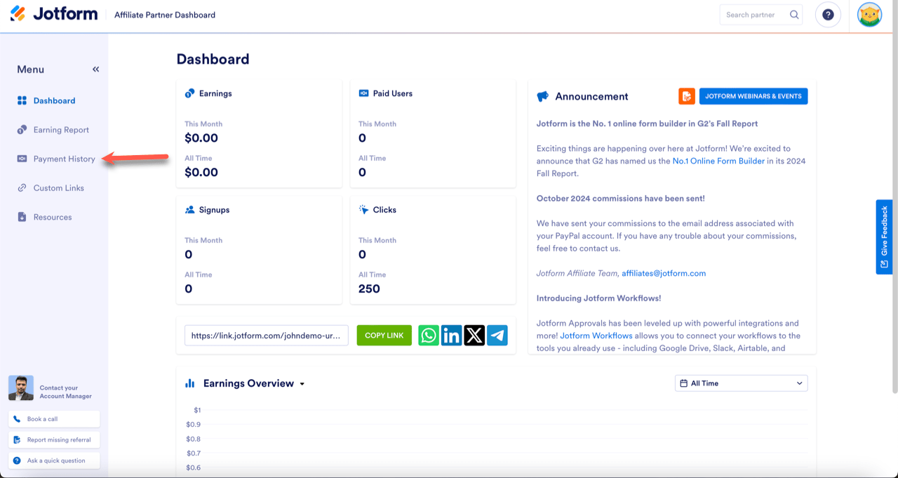 - In the Partner Dashboard, click Payment History on the left.