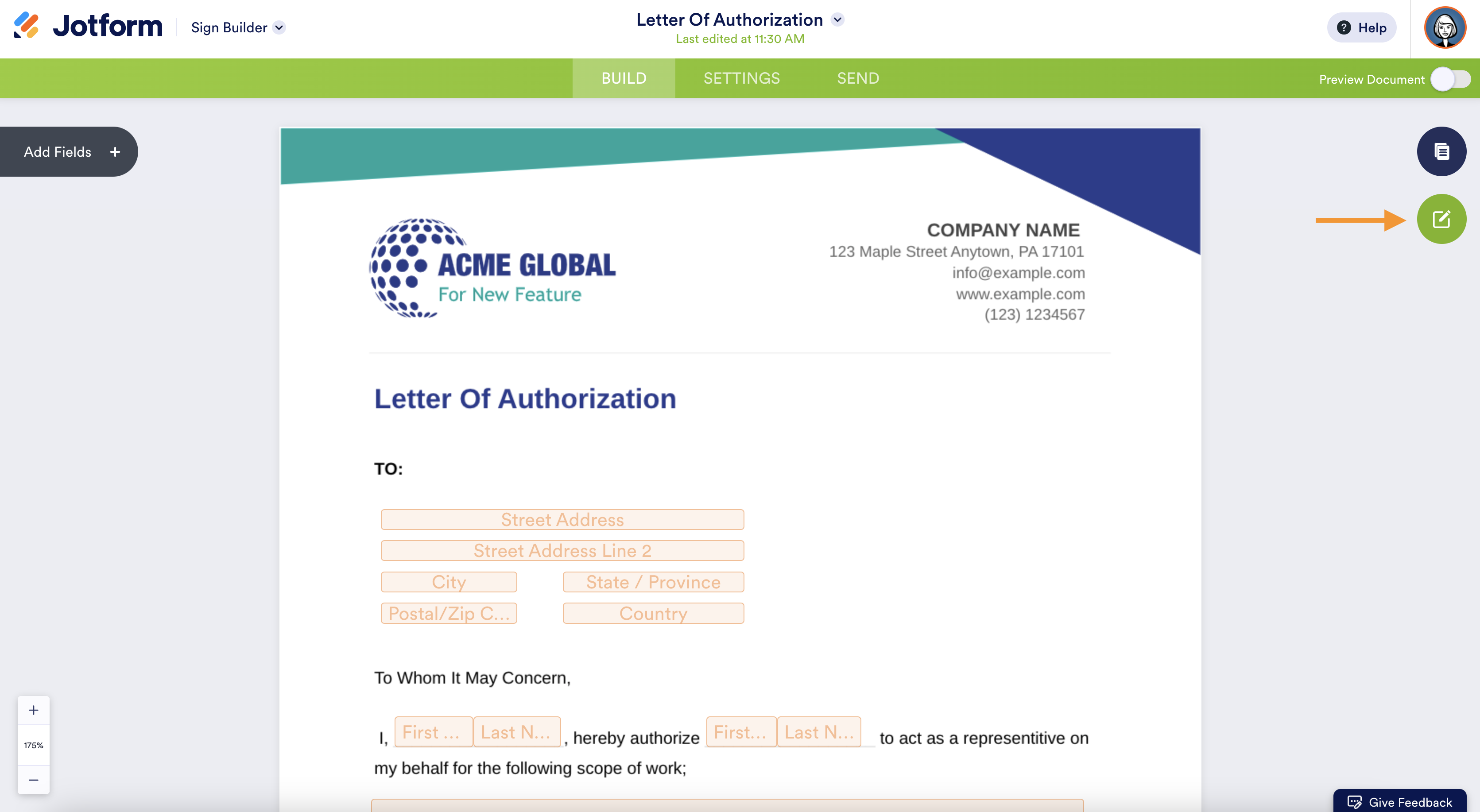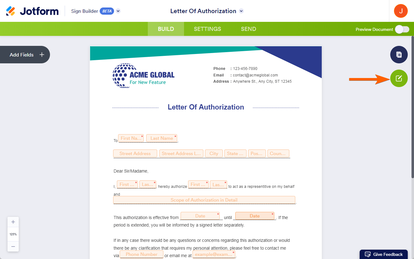 The Sign Builder does not allow you to customize an uploaded document, so if you want to have a document you can edit to match your branding, Jotform suggests using a Sign Template as it is customizable to your preference.