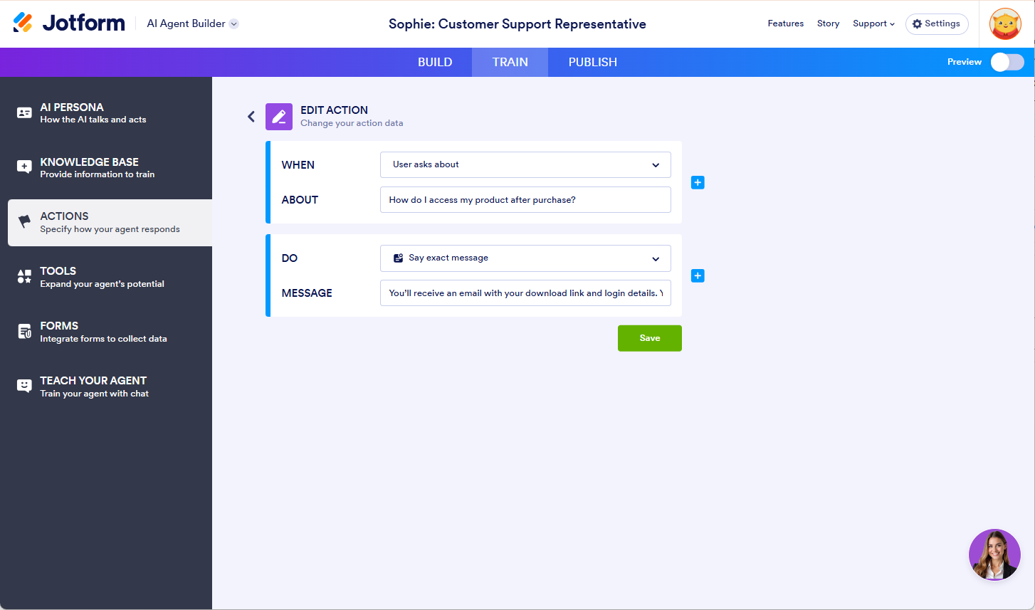 After a customer completes their purchase, your AI Agent should assist with product access, refunds, and general support. The following are samples of the Purchase Post Actions Setup.