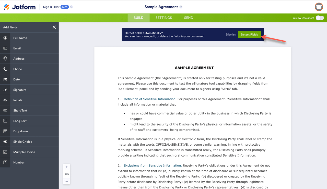 When you first upload your document to Jotform Sign, you’ll see a banner at the top asking if you would like the Sign Builder to automatically detect your document for potential fields.