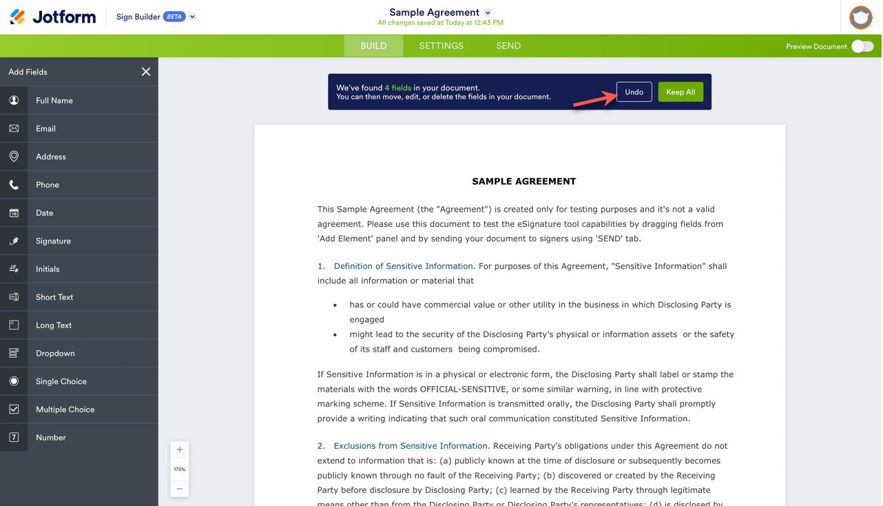 - Click the green Keep All button to save those fields, or click Undo to discard them and add your own fields to your document.
