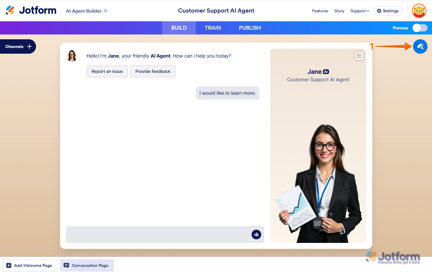 - In AI Agent Builder, click on the Paint Roller icon on the right side of the page to open Avatar Designer.