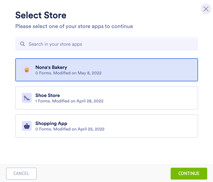 - Click on the Select Store button in the middle of the screen to see your Jotform store apps. Select a store and click Continue.