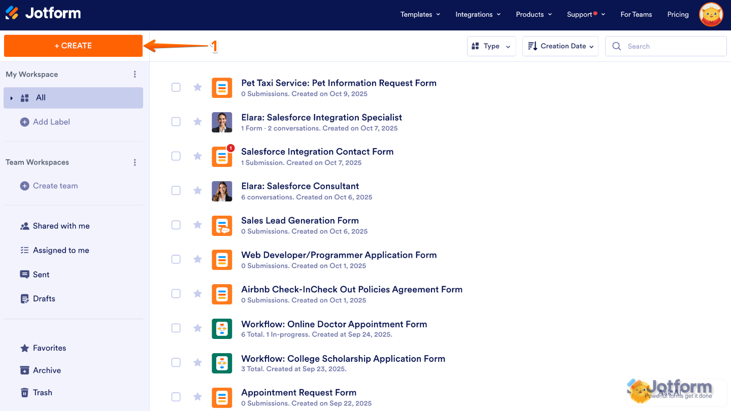 - On your Workspace page, click on Create on the top-left side of the screen.