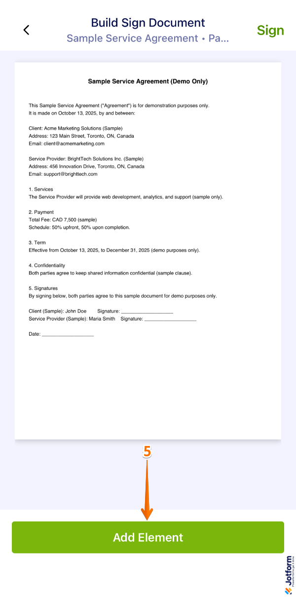 - After adding the elements, in the top-right corner of the screen, tap on Sign.