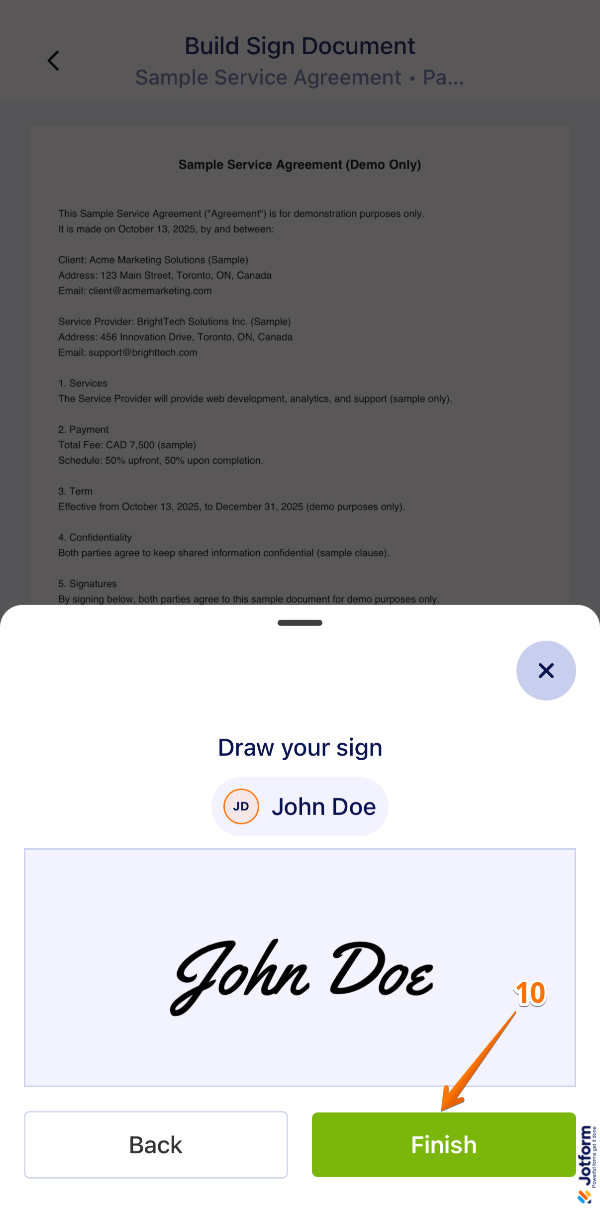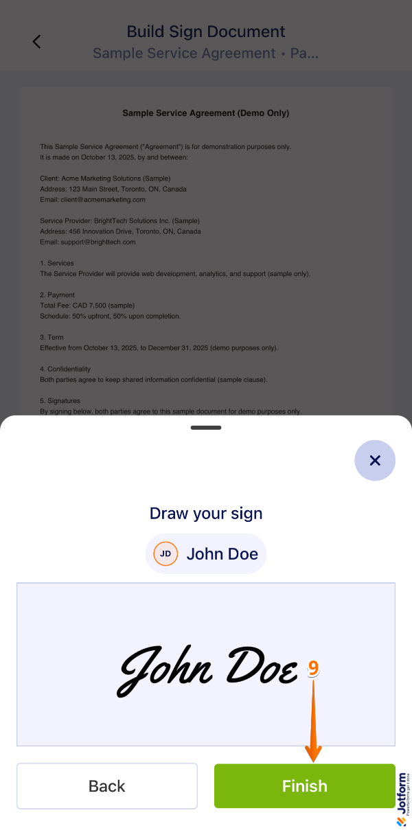 - Then, enter or draw your signature depending on the signature that you set up, and tap on Finish.