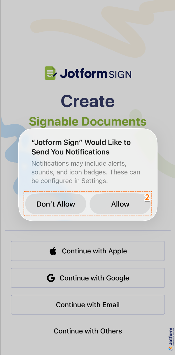 - After installing the app, open it, and in the window that comes up, choose Allow to enable notifications from your Jotform Sign Mobile App or Don’t Allow if you’d rather not get them.