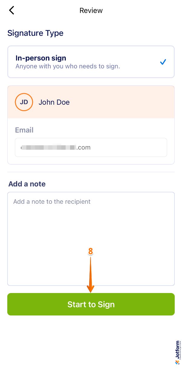 - Now, the review screen will appear based on the workflow you set. Fill in the required fields, and then tap on Start to Sign.