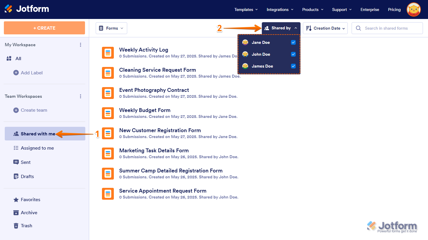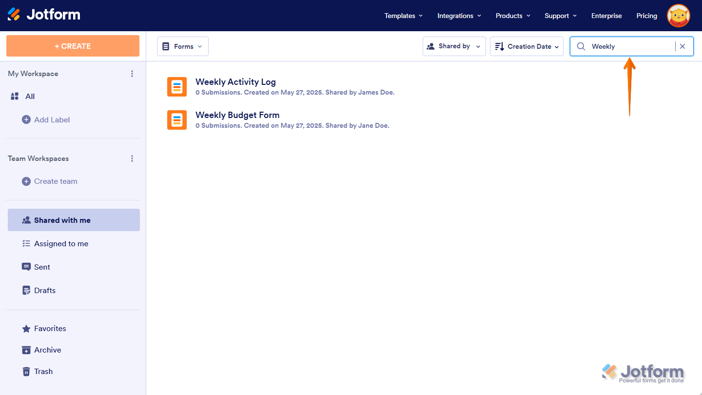 - Forms shared with you as a sub-user will have the form owner’s name under each of them in the Shared With Me section of your Workspace page.
