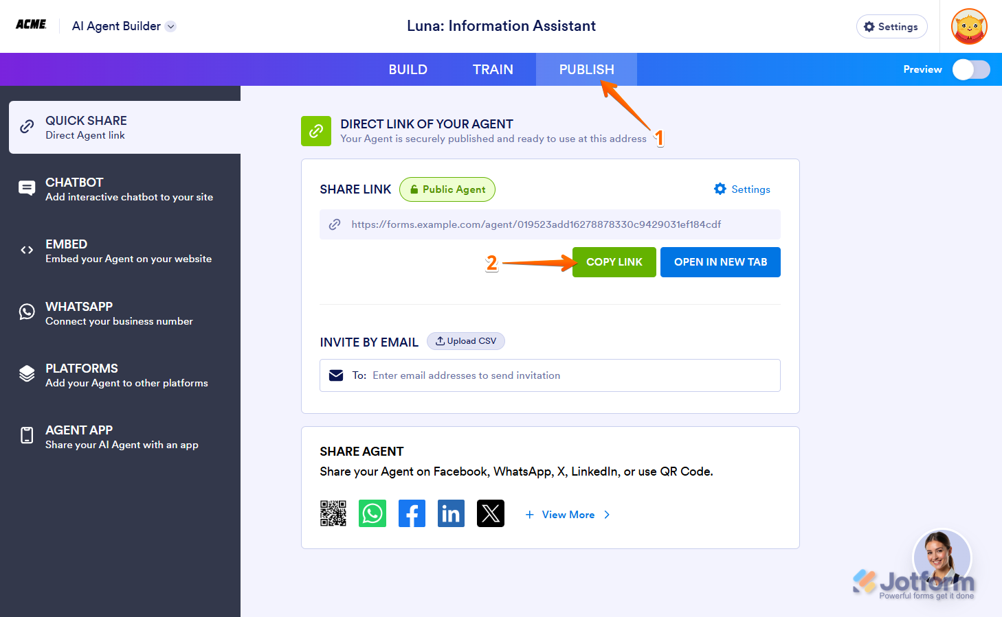 - In Jotform Enterprise AI Agent Builder, in the blue navigation bar at the top of the page, click on Publish.