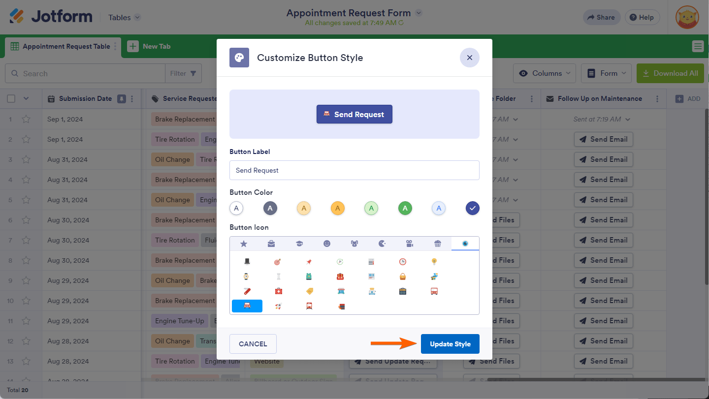 - In the Customize Button Style window, update the label, change the color, and add icons to your Action Buttons. Once you’re done, click on Update Style to save your changes.