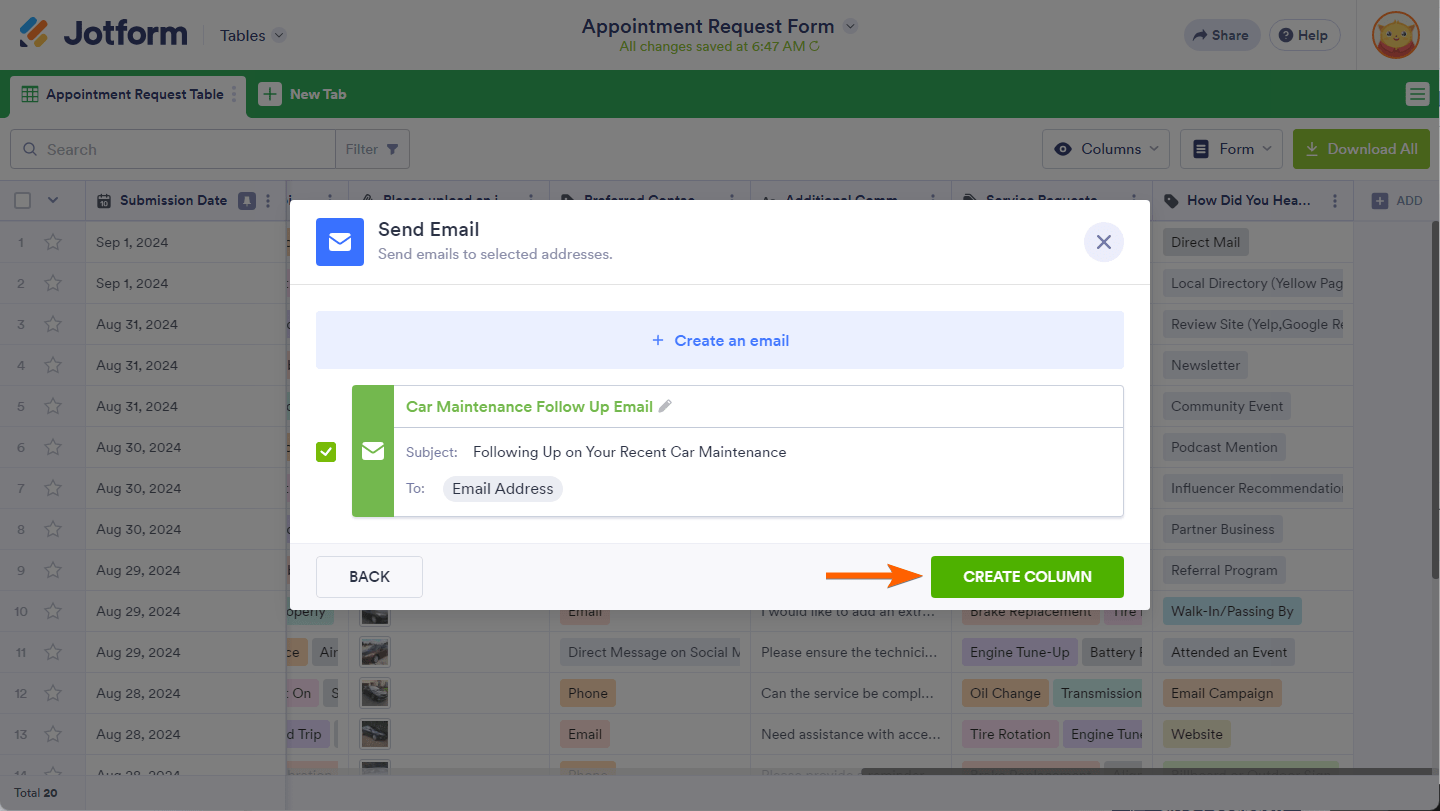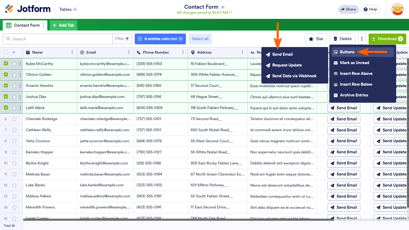 The buttons under the column in Jotform Tables trigger the actions you’ve set up for them. Whether they’re configured to send data, files, reports, or emails, assign forms, or request updates to submissions, you can activate the action for a single entry, multiple entries at once, or retrigger the button to perform the action again.