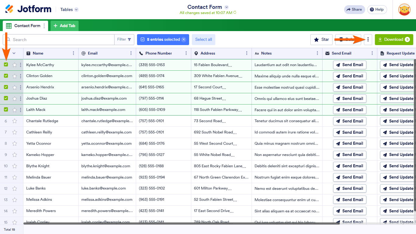 - In your table, check the box on the left side of the entries you want to perform an action on.