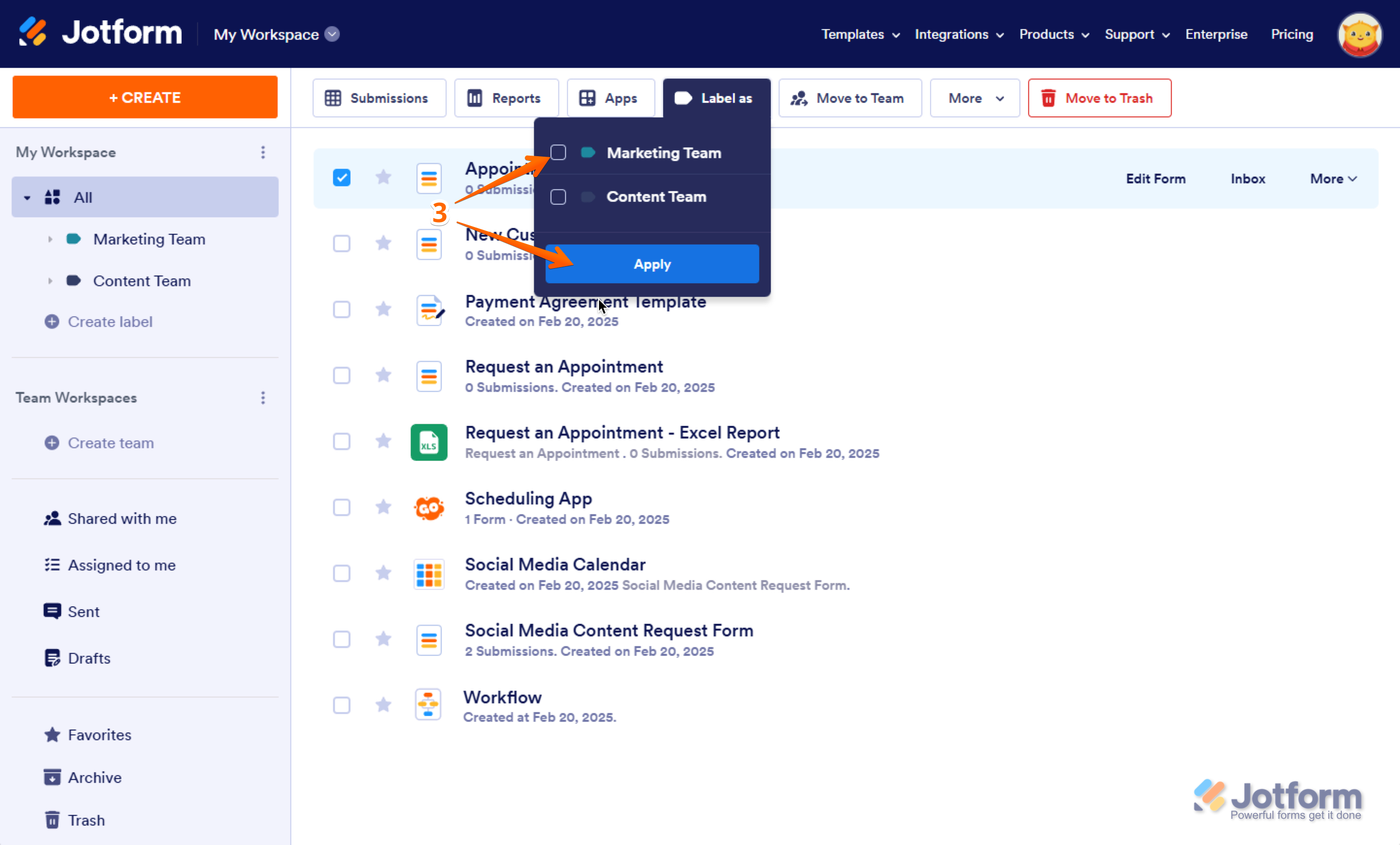 - Now, put checks in the Checkboxes next to the assets you’d like to apply labels to, for example Marketing Team, and click on Apply.