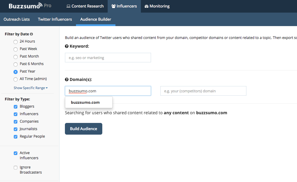 While Sprout Social and Hootsuite are analytics tools at their core, BuzzSumo highlights social media monitoring as its primary value proposition. BuzzSumo enables users to “quickly discover content ideas, uncover platform insights, identify passionate influencers, and more.” BuzzSumo tracks mentions of your brand; mentions of competing brands; and shares, backlinks, and general engagement with your posts.