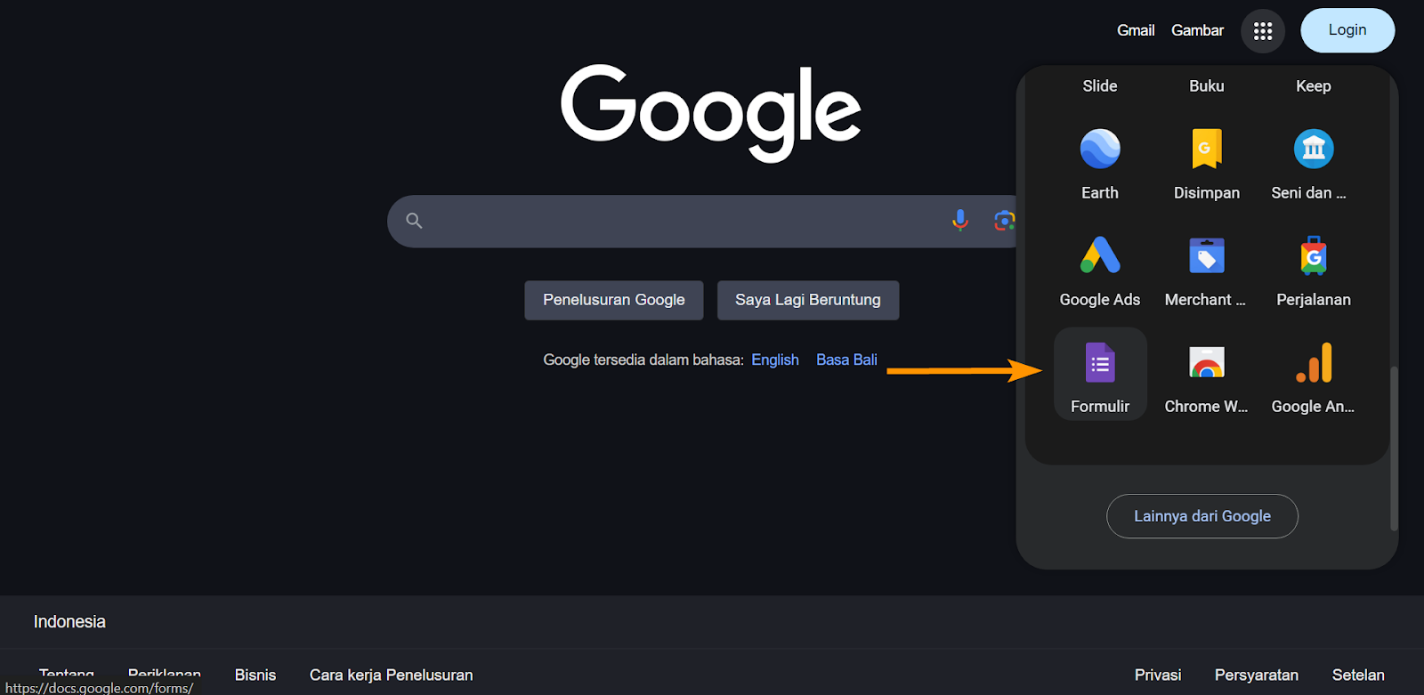 Kunjungi Google Formulir secara langsung atau melalui menu aplikasi di sudut kanan atas halaman beranda Google.