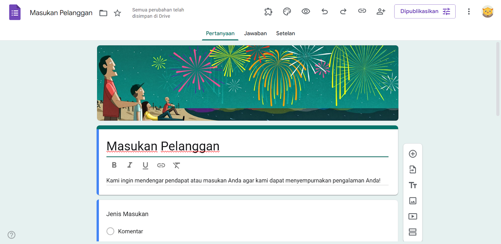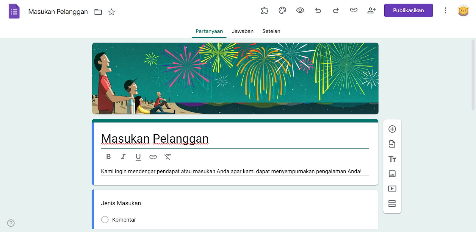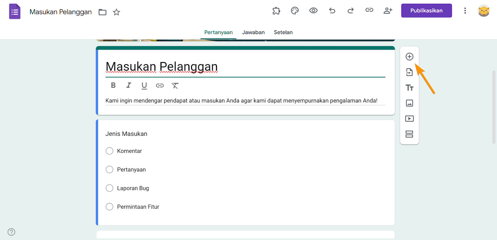 Untuk menambahkan pertanyaan di Google Formulir, klik ikon tanda tambah di sebelah kanan.