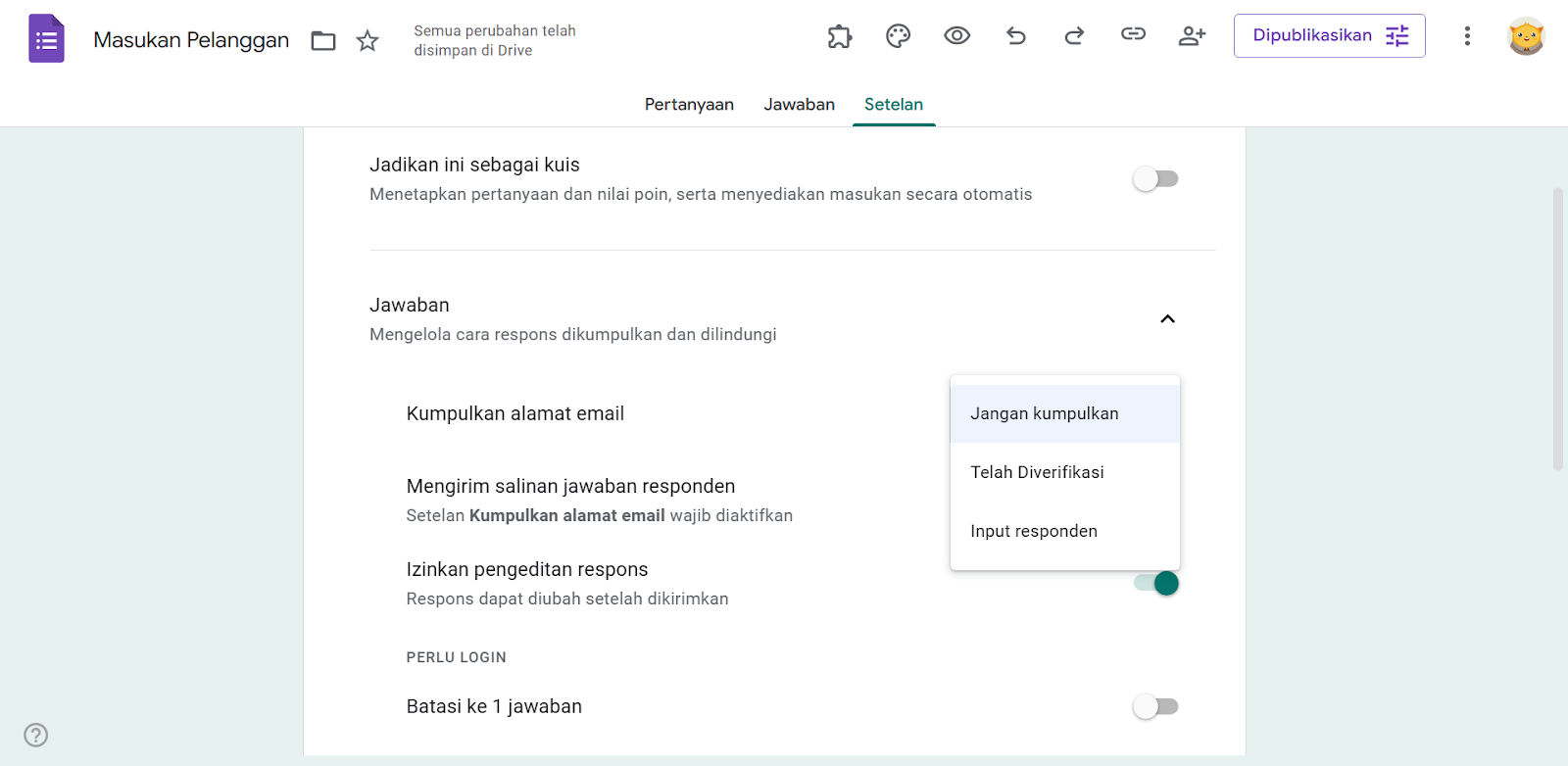 Menu ini juga memungkinkan Anda memilih apakah akan mengumpulkan alamat email responden. Dari menu dropdown di bagian atas menu, pilih Input Responden jika Anda ingin responden memasukkan email mereka secara manual, Terverifikasi jika Anda ingin pengguna masuk ke akun Google untuk mengisi survei, atau Jangan kumpulkan jika Anda tidak ingin mengumpulkan email.