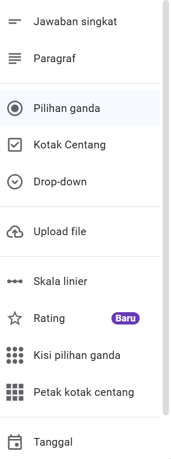Anda dapat menambahkan sejumlah jenis pertanyaan yang berbeda. Klik menu dropdown di sebelah kanan kolom pertanyaan dan pilih jenis pertanyaan yang ingin Anda gunakan.