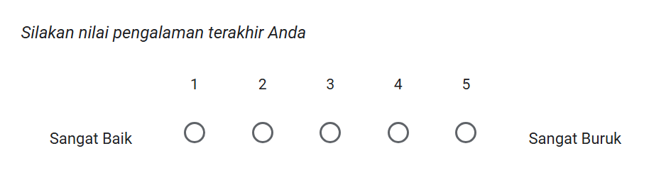 Contoh: “Silakan nilai pengalaman terakhir Anda.” Beri label skala dengan “Sangat Baik” di satu ujung dan “Sangat Buruk” di ujung lainnya.