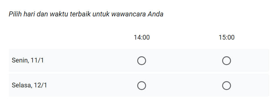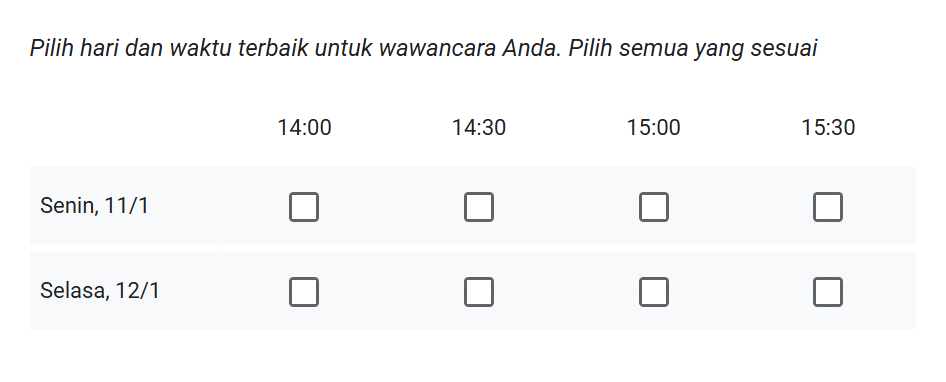 Contoh: “Pilih hari dan waktu terbaik untuk wawancara Anda. Pilih semua yang sesuai.” Baris mencantumkan hari yang berbeda, sedangkan kolom menampilkan slot waktu yang berbeda.
