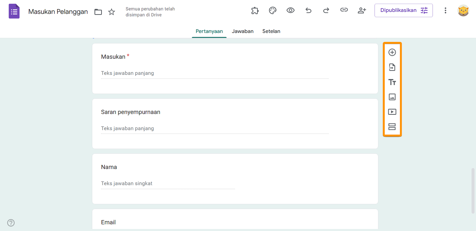 Google Formulir memiliki sejumlah opsi kolom lain untuk membantu membuat survei Anda lebih lengkap dan efektif. Anda dapat memilih fungsi-fungsi ini dari bilah alat vertikal di sebelah kanan.