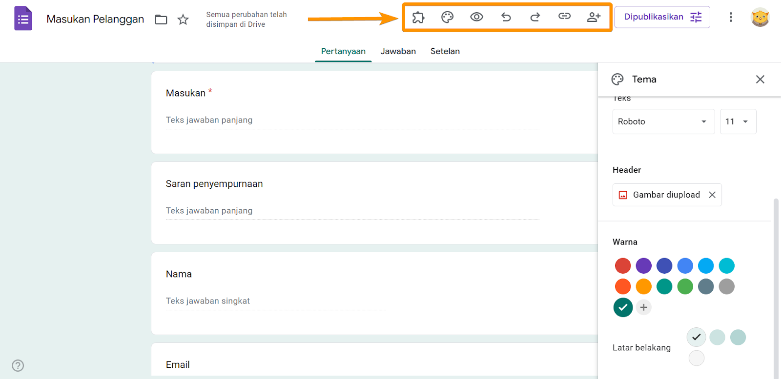 Google Formulir menyediakan opsi penyesuaian, termasuk tema yang berbeda, skema warna, dan gaya font. Lihat opsi ini dengan mengklik ikon palet cat di menu di bagian atas formulir.