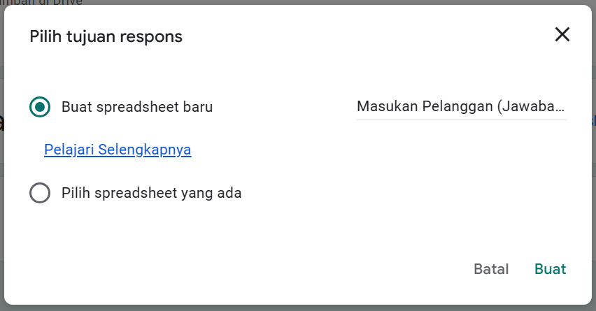 Jika Anda ingin menganalisis respons dalam spreadsheet, Anda dapat mengekspornya ke Google Spreadsheet. Cukup klik tab Jawaban, lalu pilih Link ke Spreadsheet. Ini akan membuka kotak dialog dengan opsi Buat spreadsheet baru dan Pilih spreadsheet yang ada.