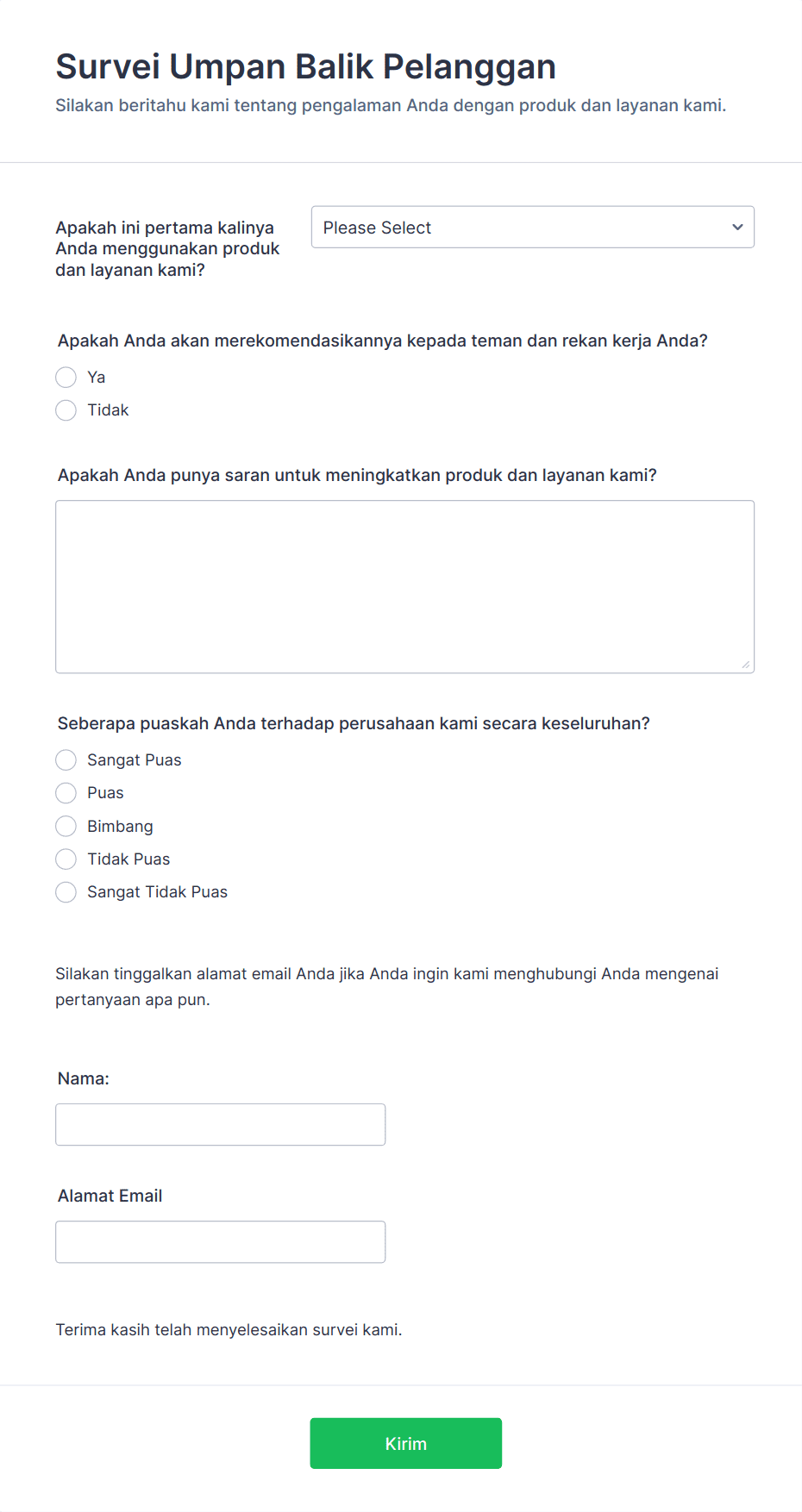 Sebuah Form Umpan Balik adalah template formulir yang dirancang untuk mengumpulkan tanggapan dan masukan dari pelanggan Anda. Solusi ini membantu Anda memahami kebutuhan pelanggan dan meningkatkan pengalaman mereka dengan layanan Anda.