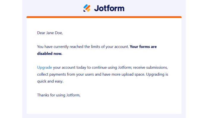 Mencapai Ruang Unggahan atau batas bulanan mana pun akan meminta sistem untuk menonaktifkan formulir Anda pada tanggal yang dijadwalkan yang ditunjuk dalam email yang dikirimkan kepada Anda. Formulir Anda juga akan menampilkan pesan “Formulir melebihi kuota”.