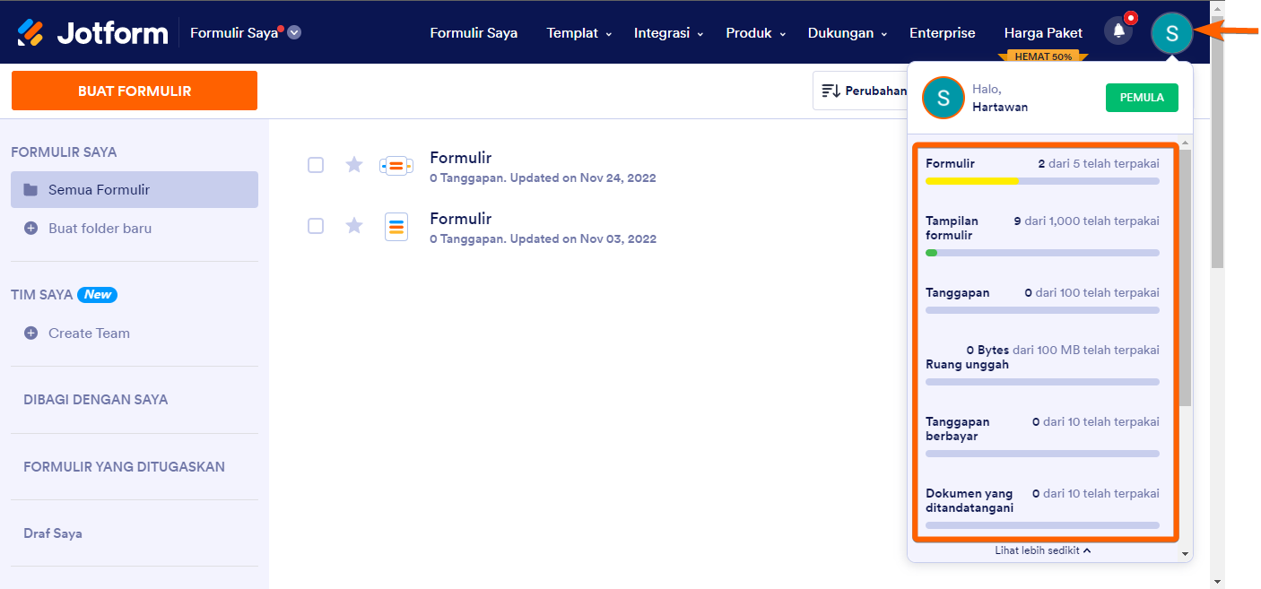 Anda dapat melihat penggunaan dan batas Anda saat ini dengan mengklik avatar Anda di pojok kanan atas halaman.