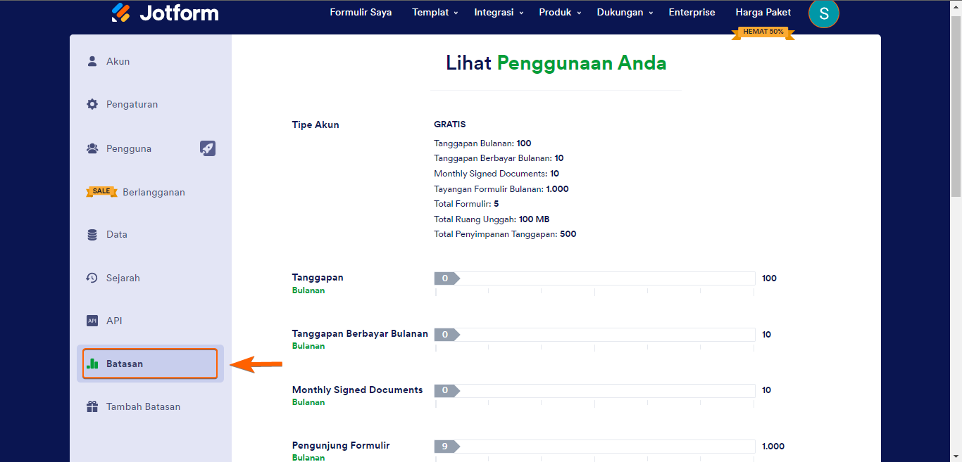 Catatan: Melebihi batas ini akan menghapus entri formulir terlama untuk memberi ruang bagi tanggapan baru. Untuk menghindari kehilangan data, lihat Mengunduh Kiriman Formulir. - Notifikasi Email — Batas ini khusus untuk paket Pemula (Gratis) di mana hanya satu Notifikasi Email dengan satu penerima yang dapat digunakan. Untuk informasi selengkapnya, lihat Mengirim Notifikasi ke Beberapa Penerima.