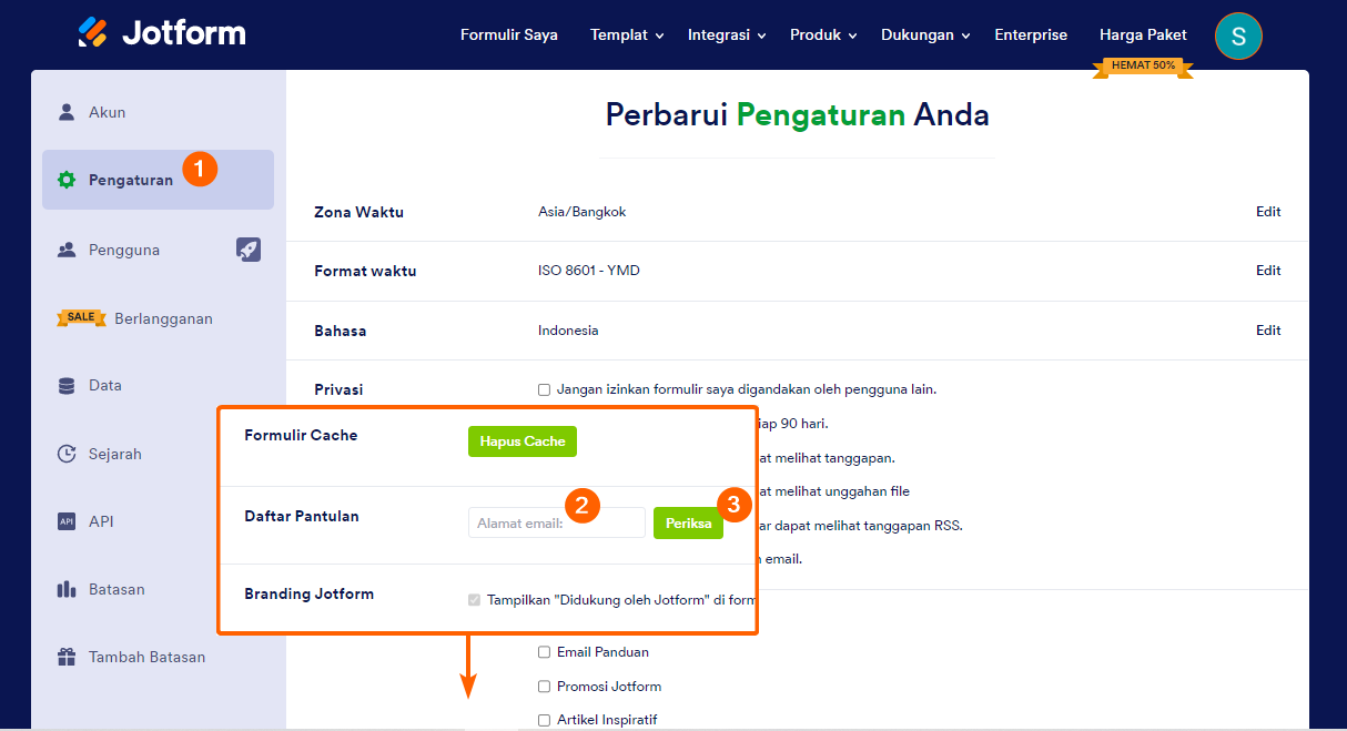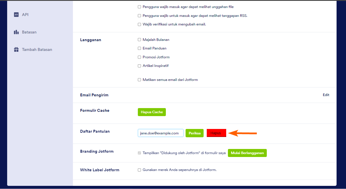 Ada beberapa alasan mengapa alamat email Anda mungkin telah ditambahkan ke daftar pantulan. Ini mungkin karena alamat email yang tidak ada/tidak aktif, server email Anda tidak tersedia, server email Anda telah menolak email karena dicurigai sebagai spam, kotak surat Anda penuh atau Jotform ada di blacklist Anda. Jotform akan berhenti mengirim email saat alamat email ada di daftar pantulan.