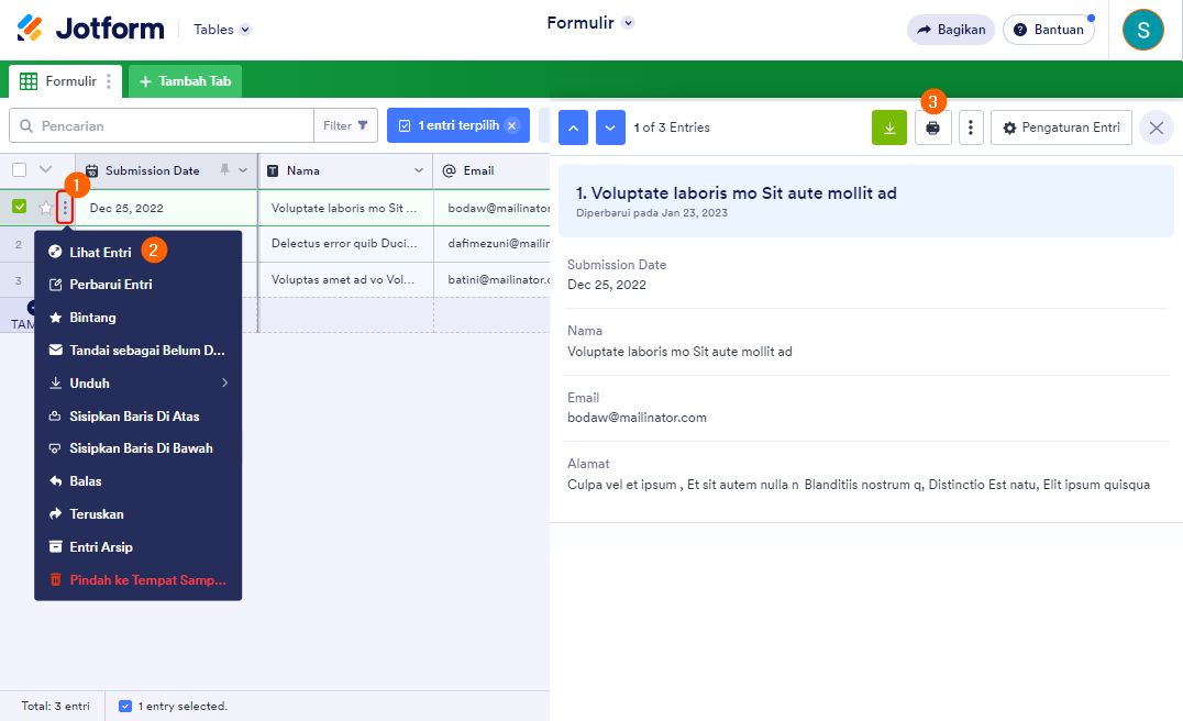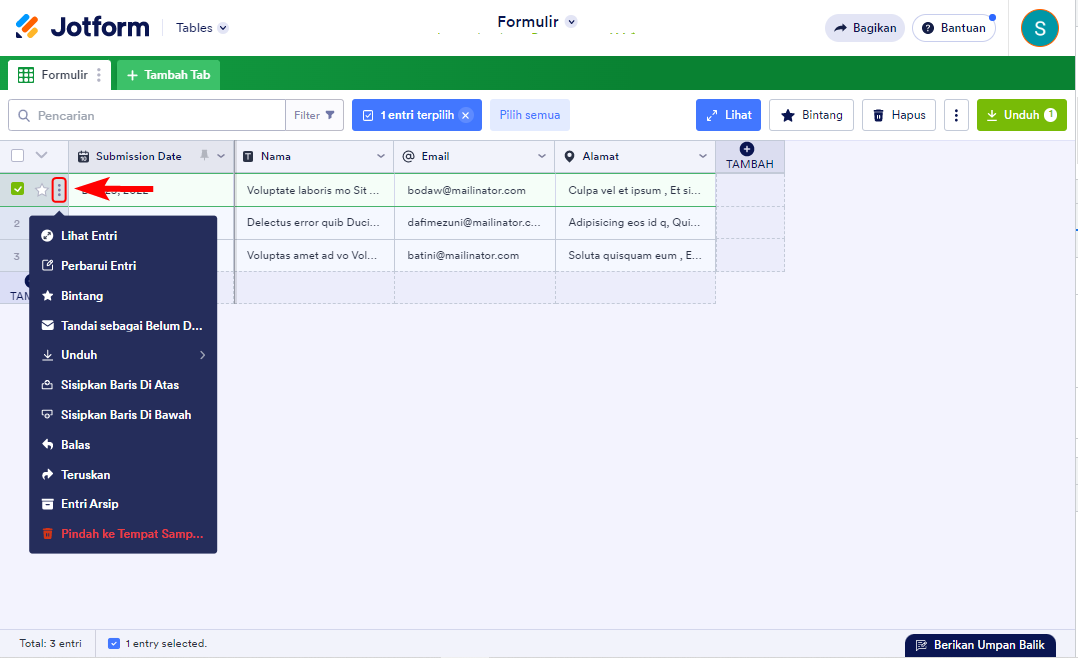 Klik ikon elipsis vertikal entri di Tabel Jotform untuk melihat opsi masing-masing tanggapan.