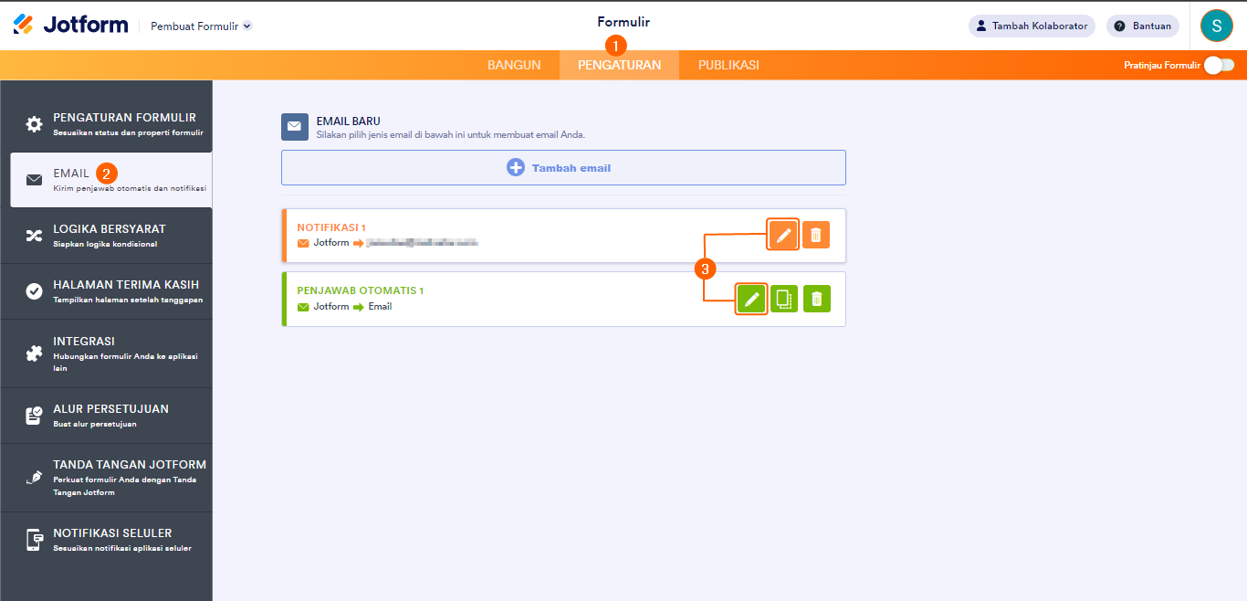 - Arahkan kursor ke Notifikasi Email atau Penjawab Otomatis dan klik ikon pensil.