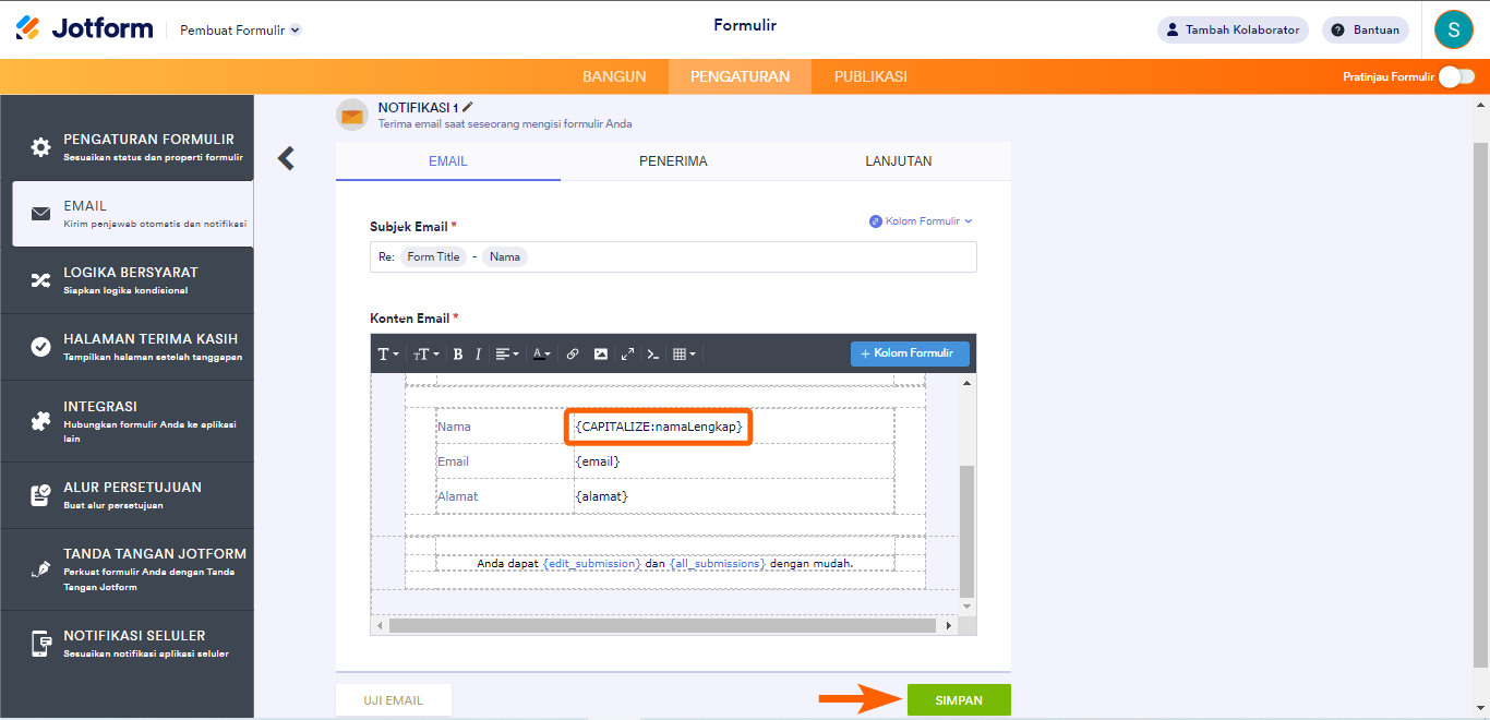 Setelah Anda membuka Editor Email, pilih nama unik bidang dan tambahkan awalan CAPITALIZE: Misalnya, Nama Unik {namaLengkap} harus diubah menjadi {CAPITALIZE:namaLengkap}.