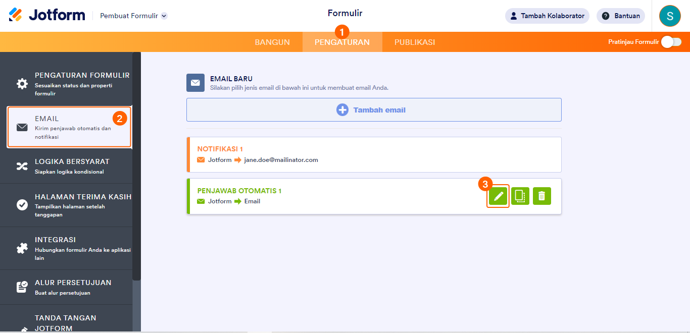- Pilih tab Pengaturan di Pembangun Formulir.