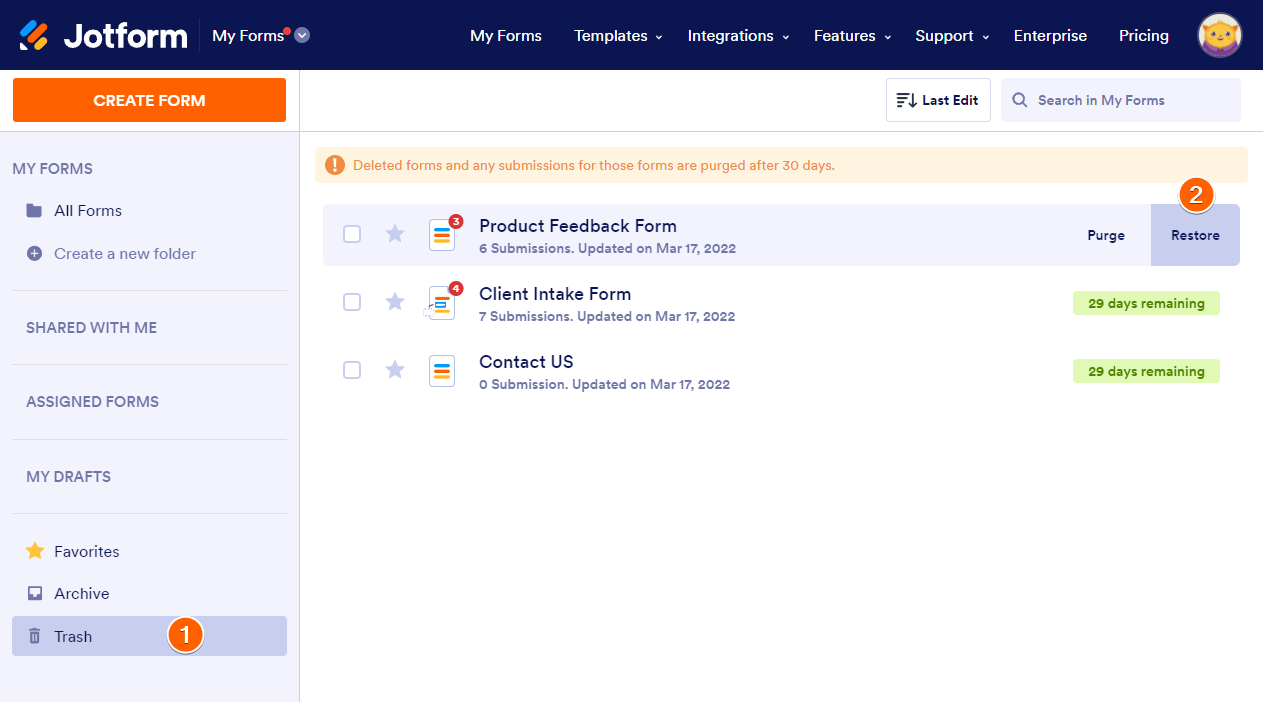 Sistem secara otomatis menghapus formulir yang dibuang setelah 30 hari. Dalam hal ini, Anda tidak dapat memulihkannya lagi. Anda juga tidak dapat memulihkan formulir yang sengaja Anda hapus dari folder Sampah.