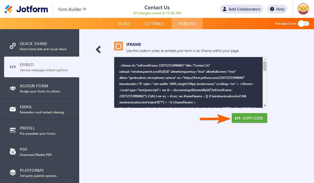 - Klik tombol Salin Kode untuk menyalin kode iframe formulir Anda.