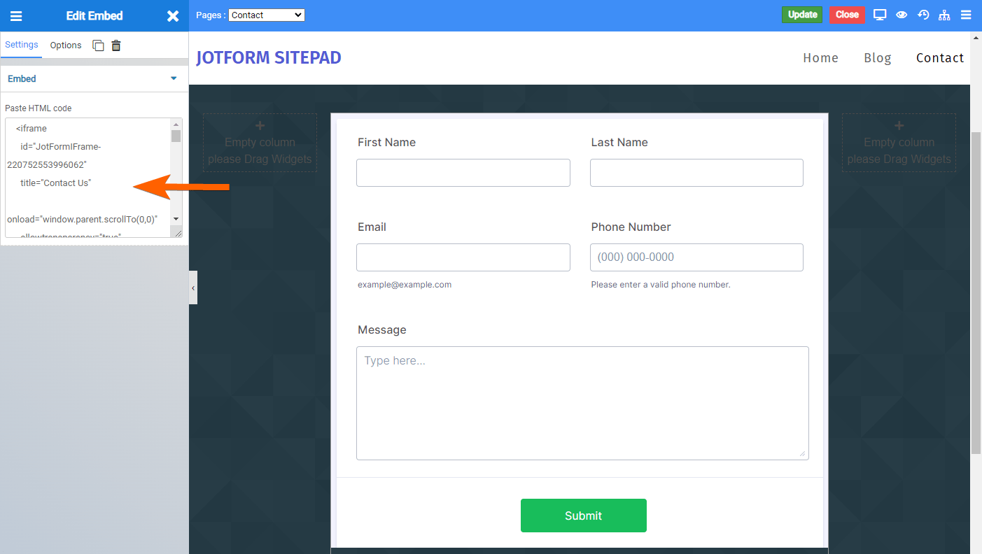 Jika Anda memiliki formulir Jotform, Anda dapat menyematkannya di situs SitePad Anda. Dengan fitur seret dan lepas SitePad, formulir Anda akan ditampilkan dalam waktu kurang dari satu menit. Silakan baca di bawah ini untuk langkah-langkahnya.