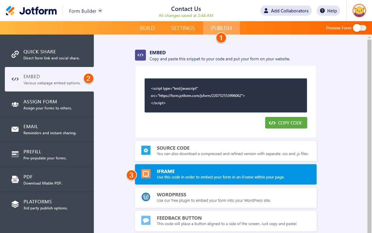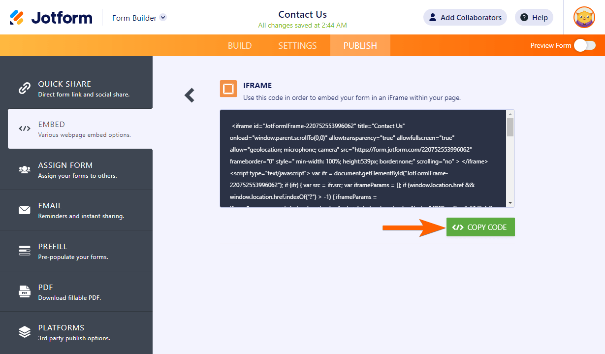 Anda sekarang memiliki kode sematan formulir siap untuk disematkan.