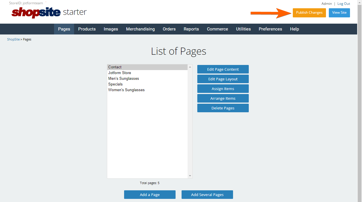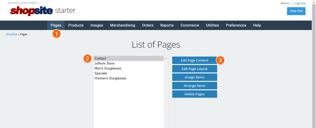 - Login ke dasbor ShopSite Anda, dan klik Halaman dari navigasi.
