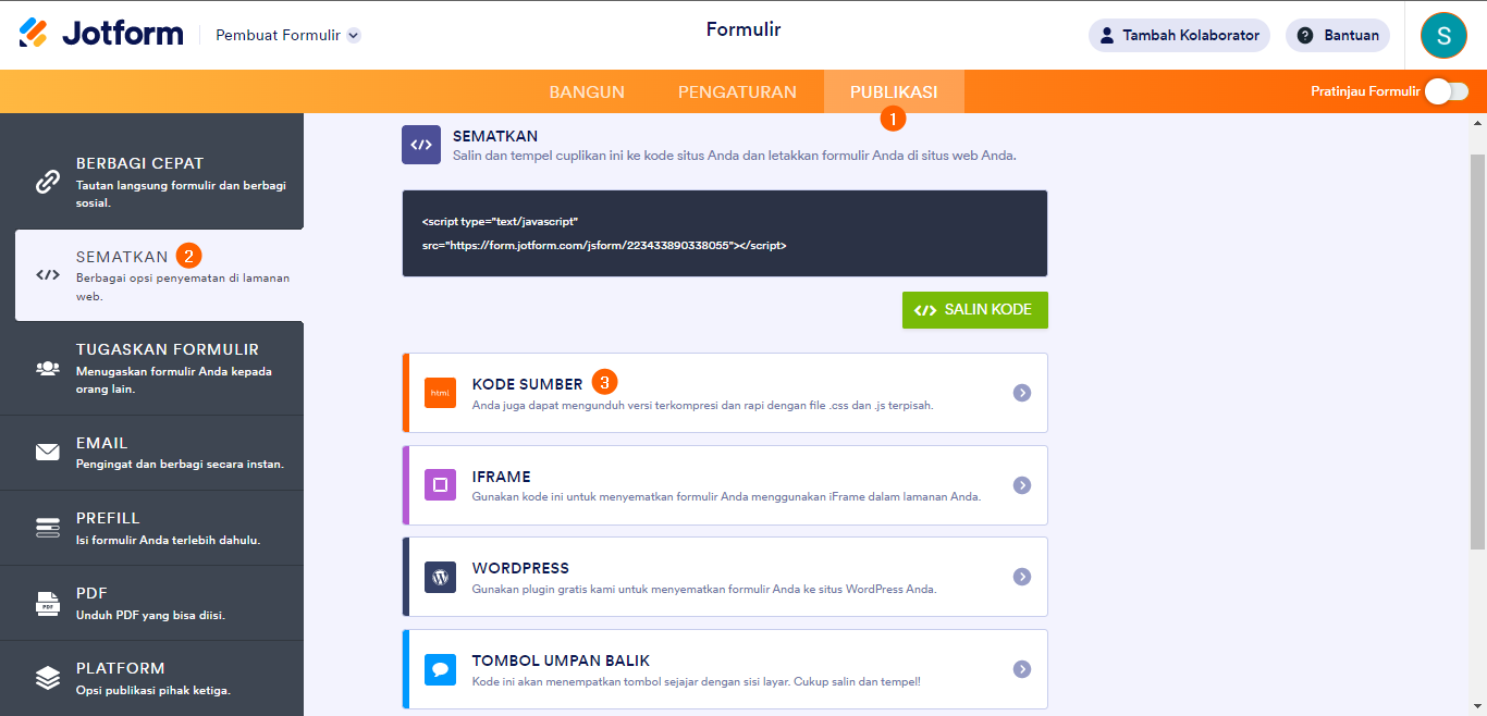 - Klik tombol Salin Kode untuk menyalin kode sumber formulir.