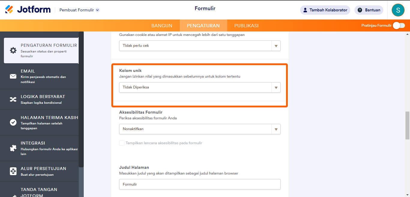 Bidang Unik adalah salah satu fitur Jotform yang memungkinkan Anda untuk menetapkan batas berdasarkan jawaban dari bidang spesifik. Misalnya, terima alamat email unik atau mencegah seseorang mengirim data yang sama pada elemen Entri Teks Pendek.