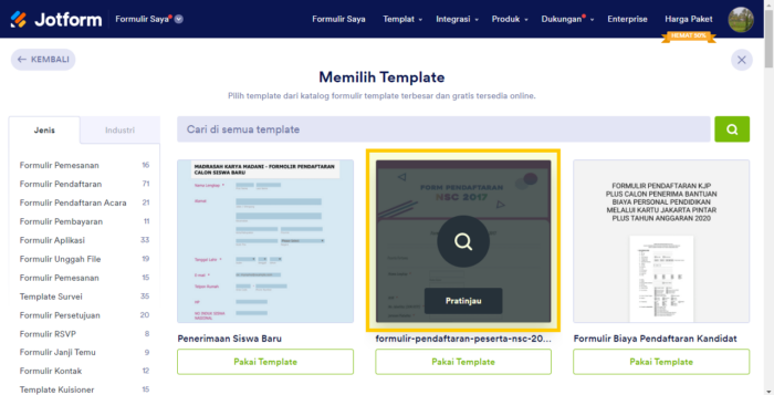3. Gunakan bilah pencarian untuk menemukan templat formulir yang paling sesuai dengan kebutuhan Anda. Setelah Anda menemukan formulir, klik tombol Pakai Templat.