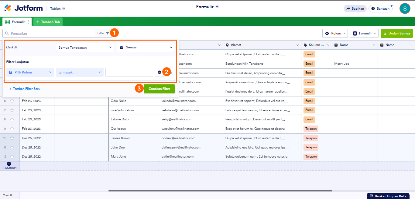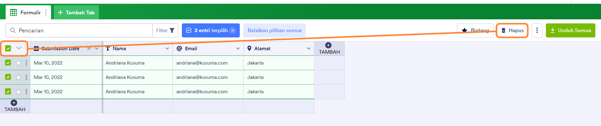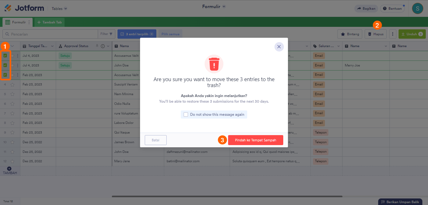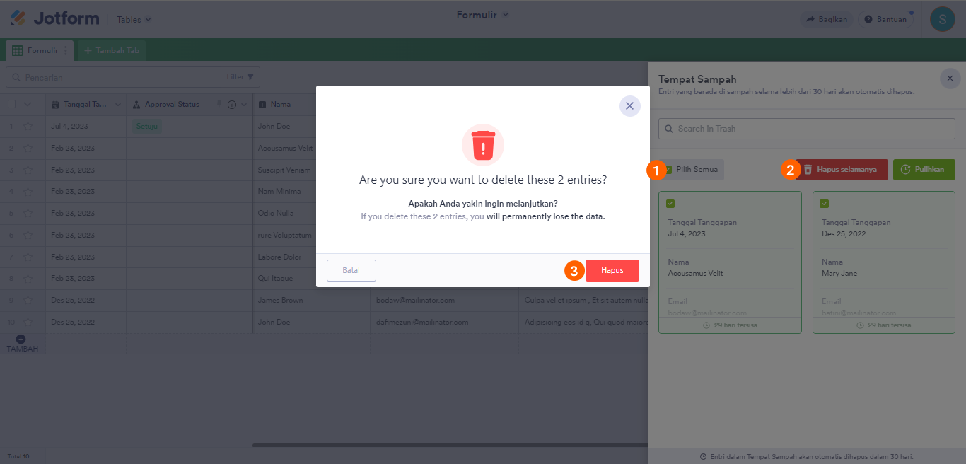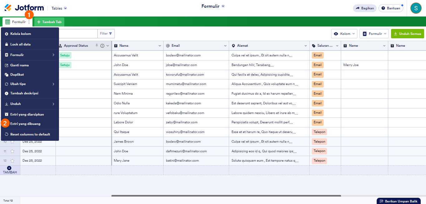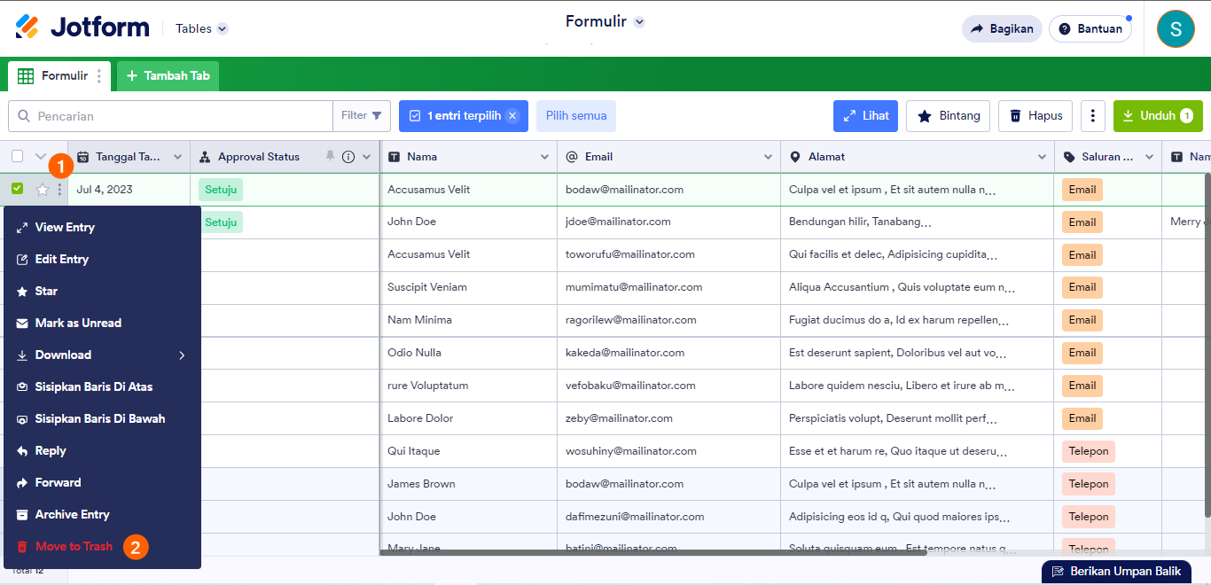 Pada Tabel Jotform, Anda dapat menghapus