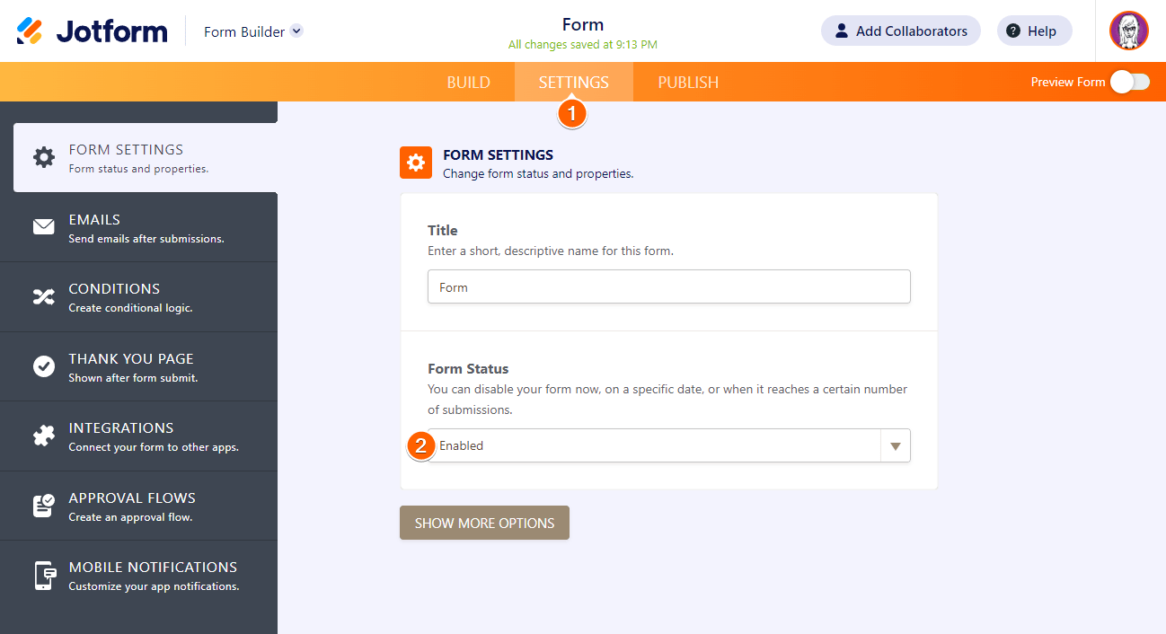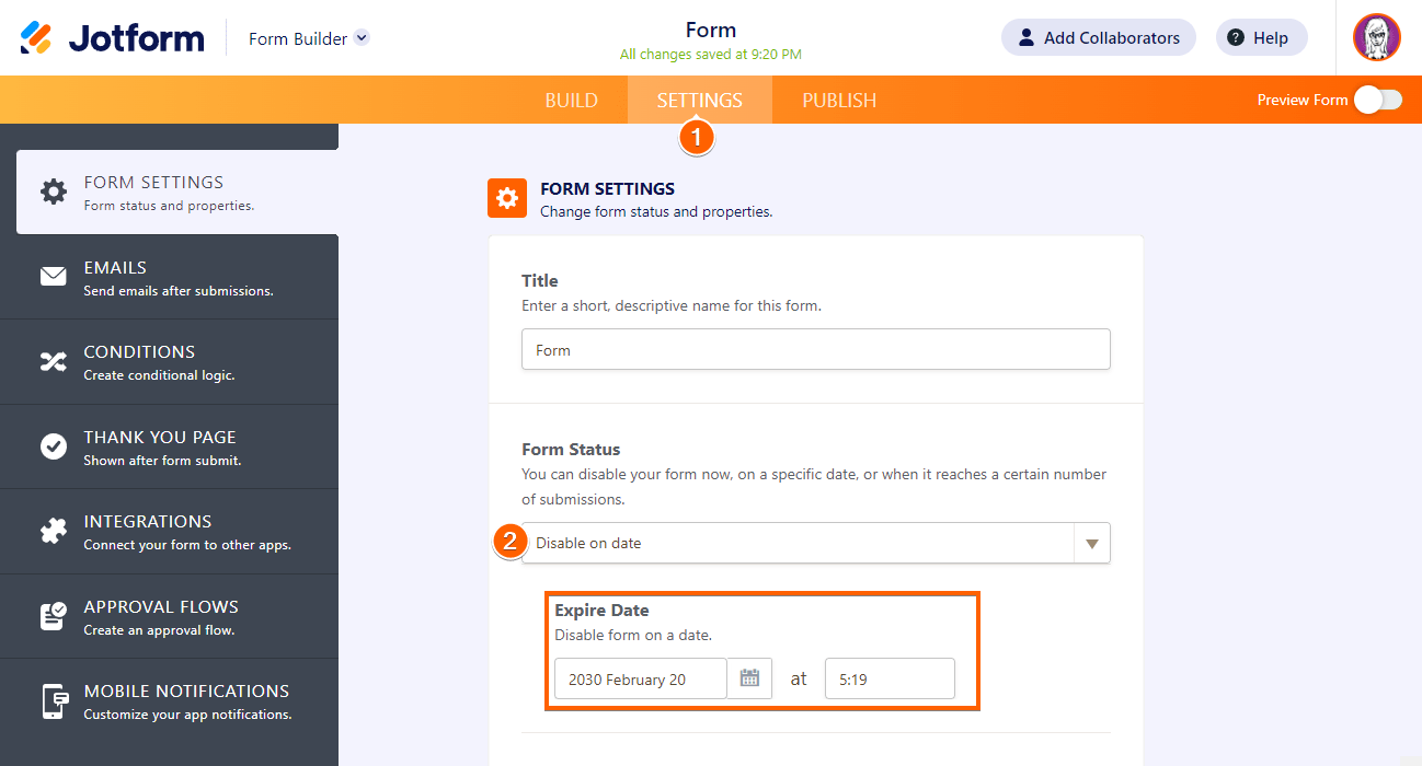 Yang harus Anda lakukan adalah menghapus atau menyesuaikan tanggal kedaluwarsa pada formulir Anda. Buka tab Pengaturan Pembuat Formulir dan atur Status Formulir ke Aktifkan.